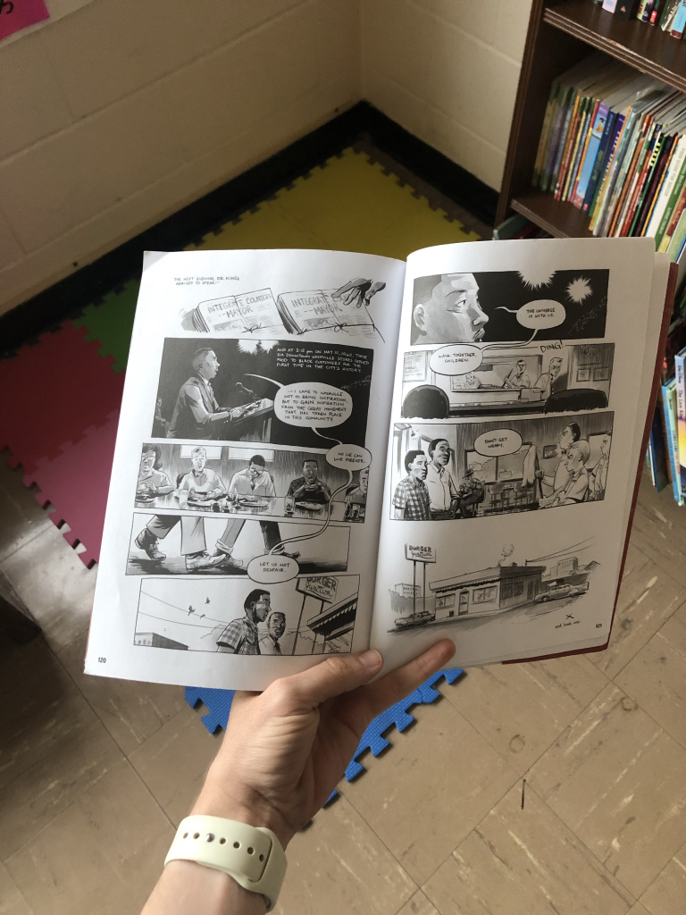We’ve been reading a lot of books inspired by civil rights activists and leaders to guide our discussion. Several weeks ago, some of them and I read this one together – an illustrated graphic memoir about the early life of John Lewis.
